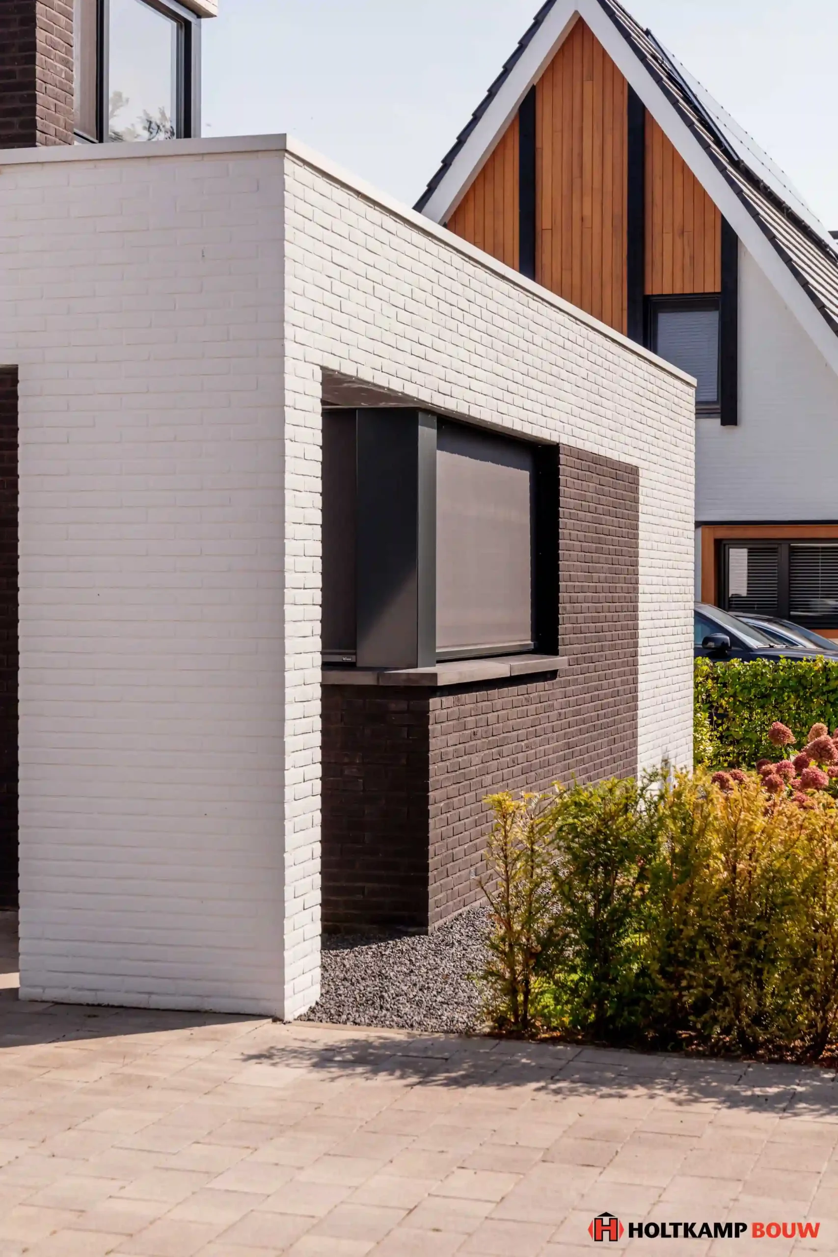 Deze fraaie wit gekeimde kubistische woonhuis is in samenwerking met onze klant geheel naar wens en budget met de expertise van Holtkamp Bouw op deze kavel ontworpen en gebouwd.