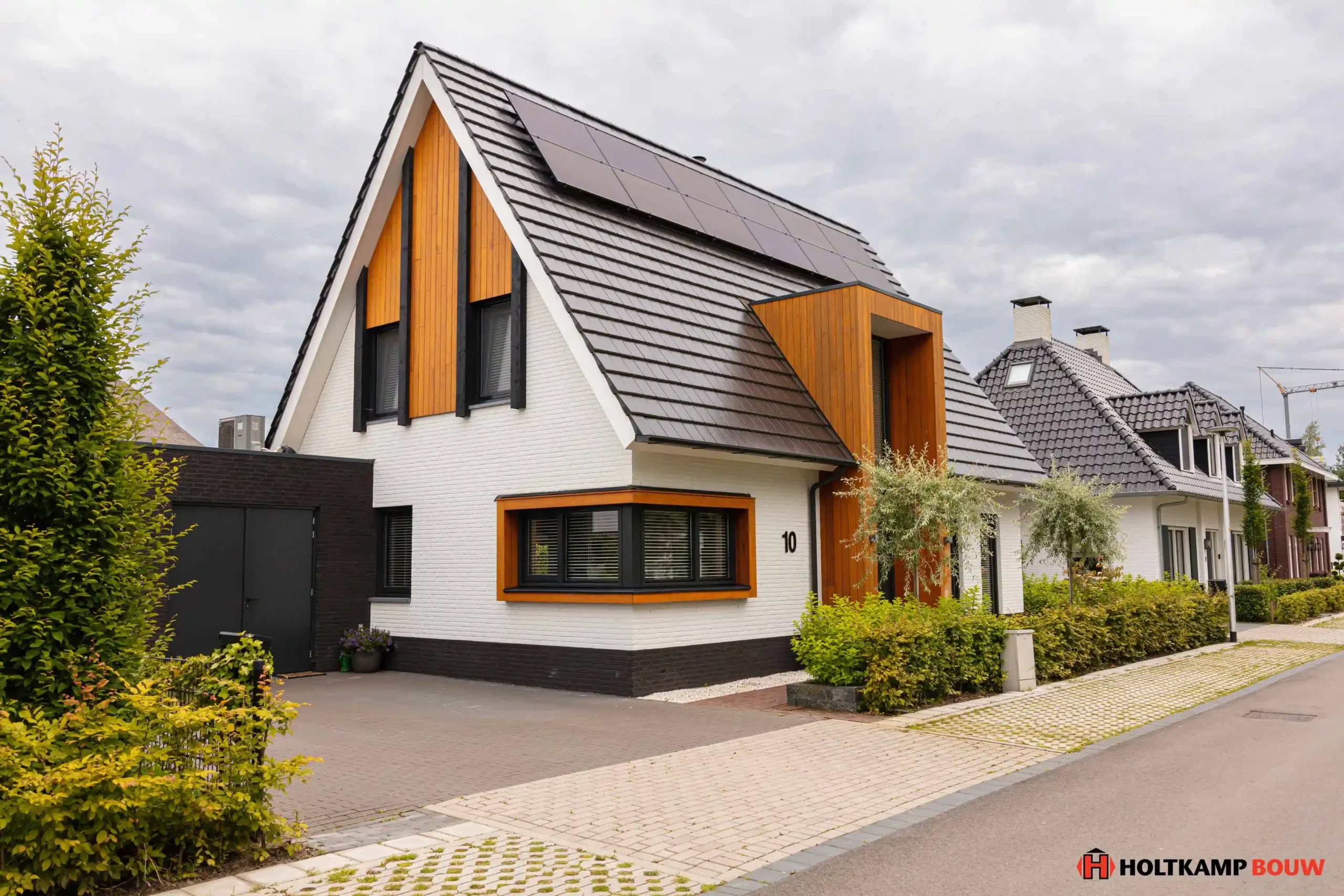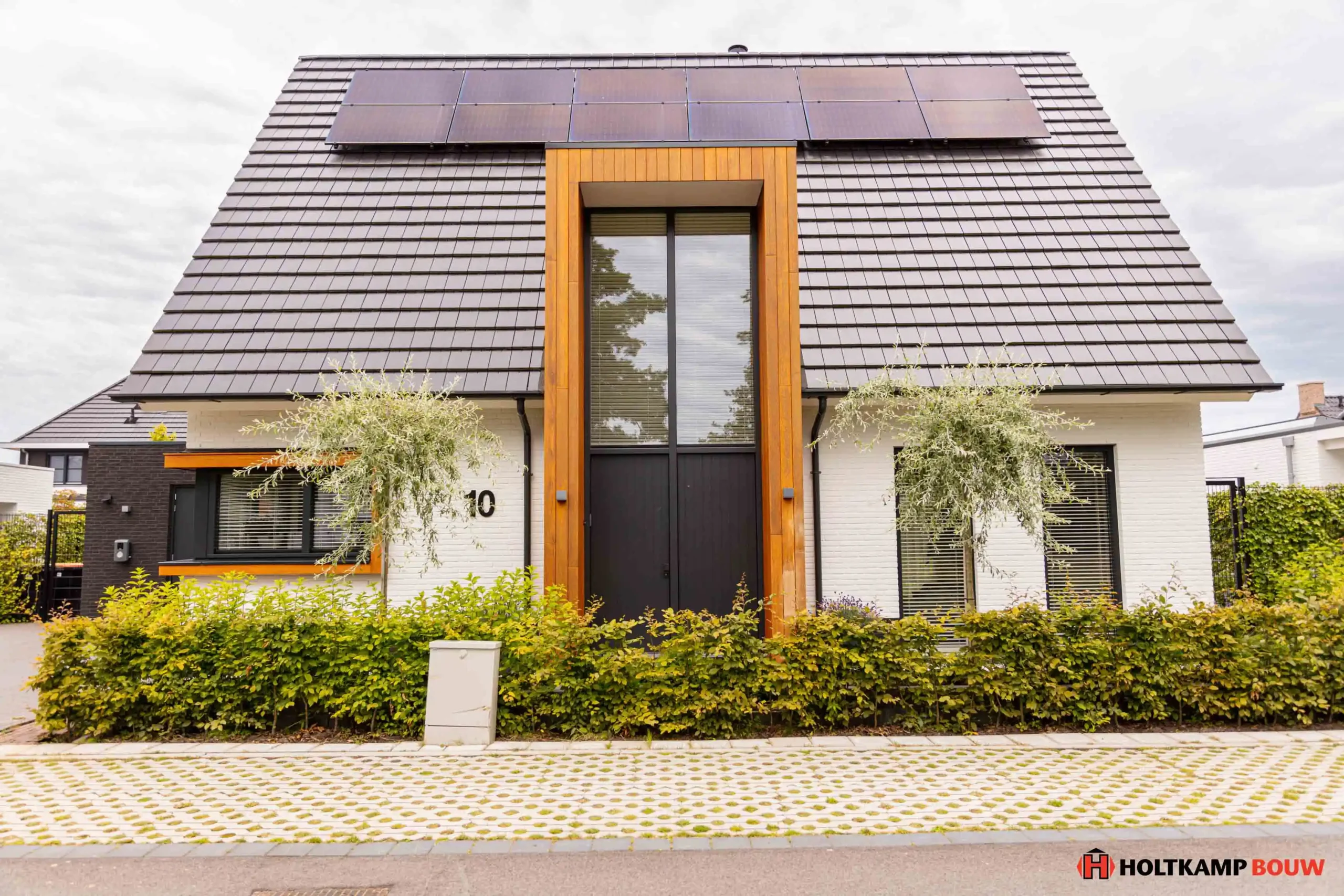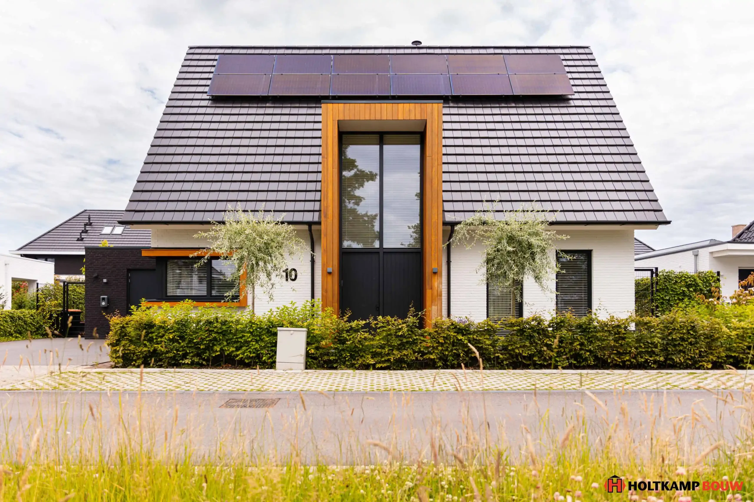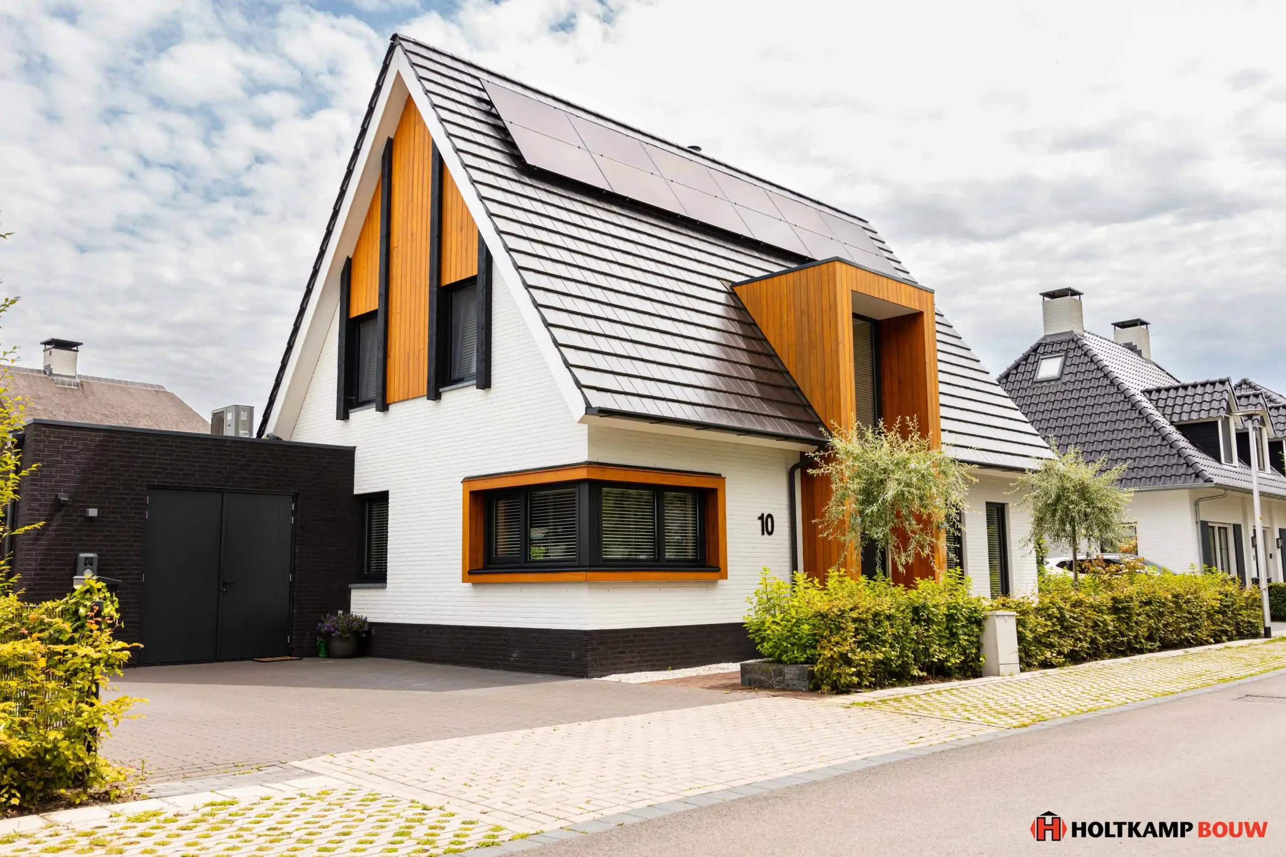 Met een goothoogte van 3500mm behoudt de woning een menselijke schaal, terwijl het toch een imposante uitstraling heeft. Zoals bij alle projecten van Holtkamp Bouw, is deze woning een eigen ontwerp, wat betekent dat elk detail nauwkeurig is afgestemd op de wensen van de klant en de specifieke kenmerken van de locatie.