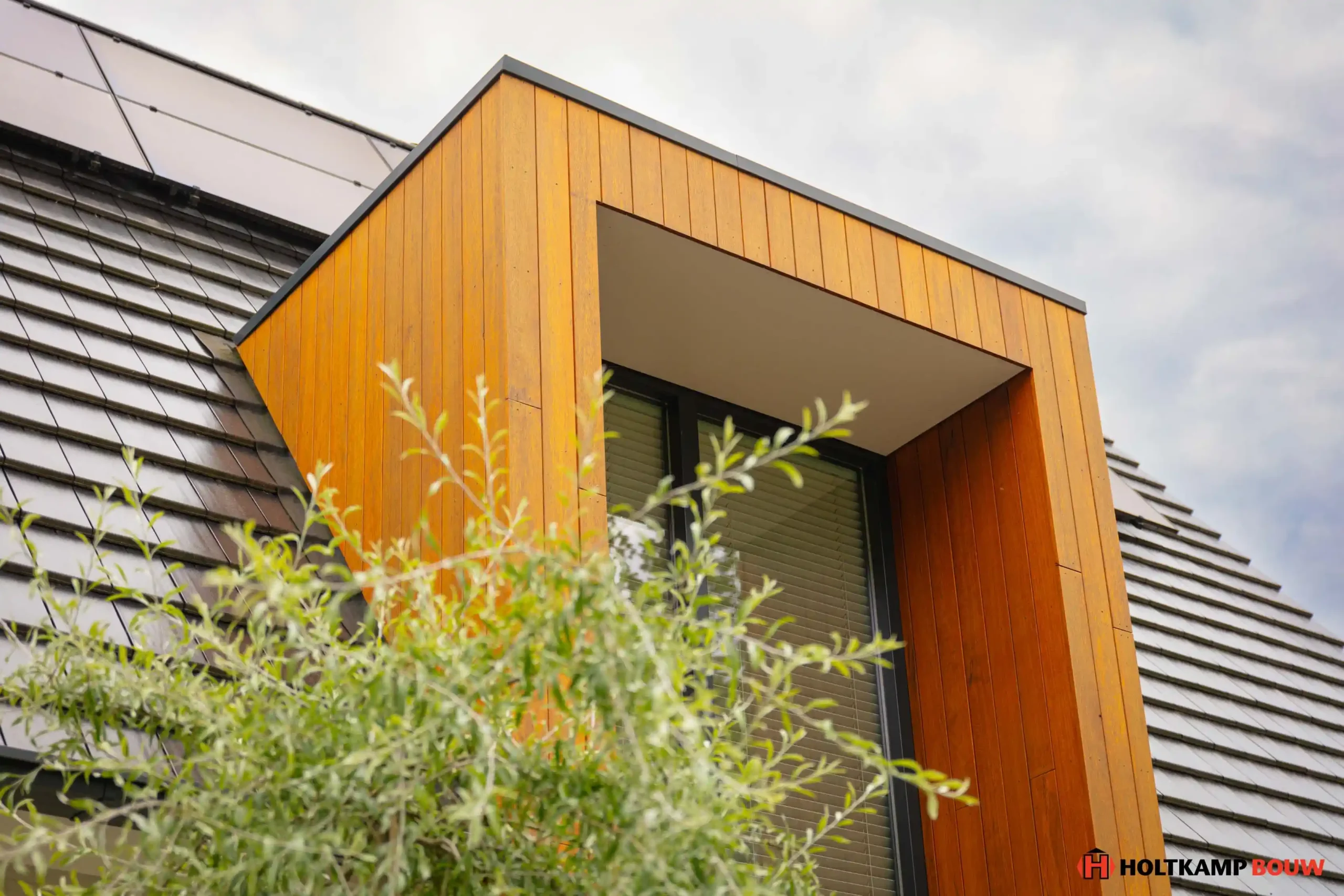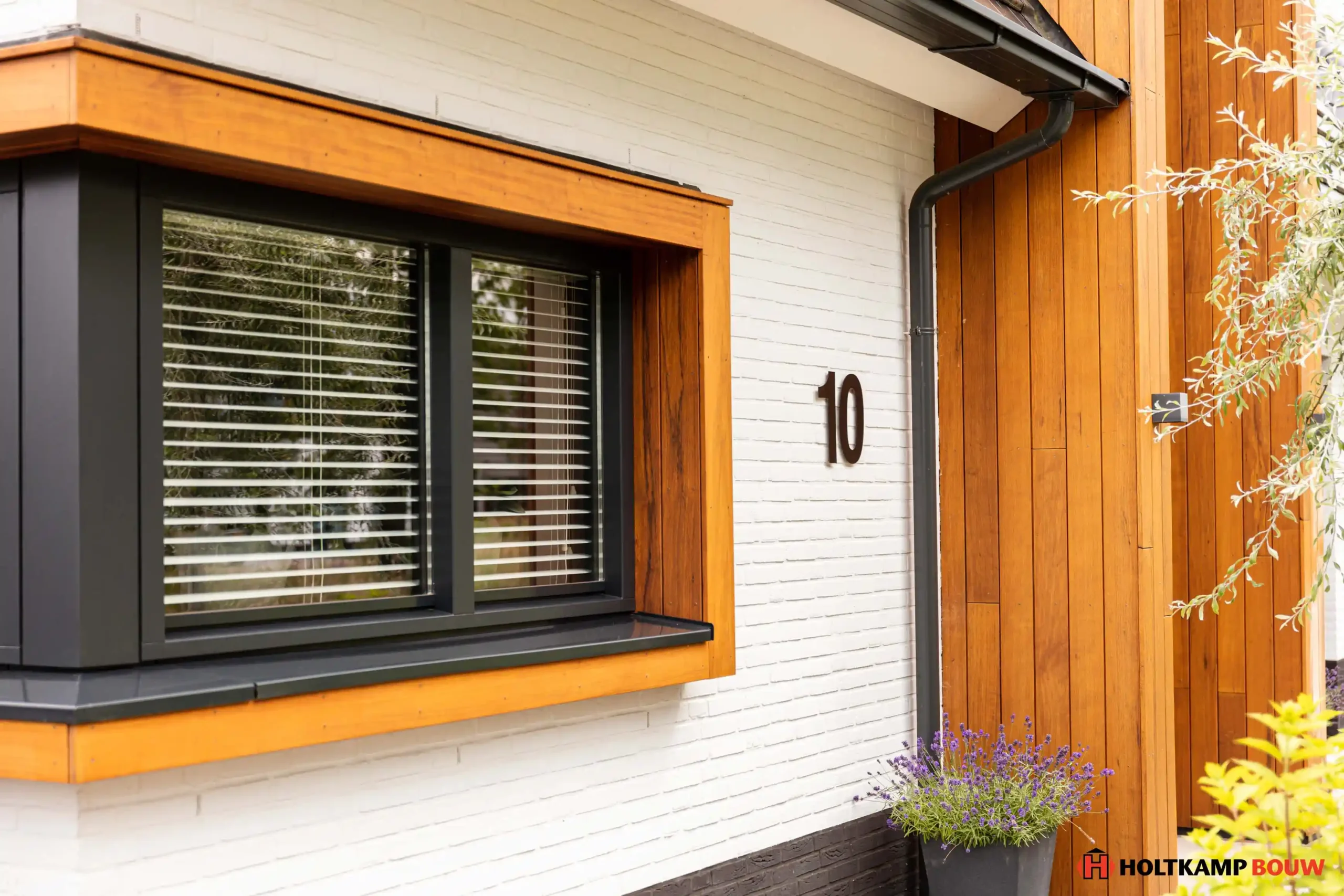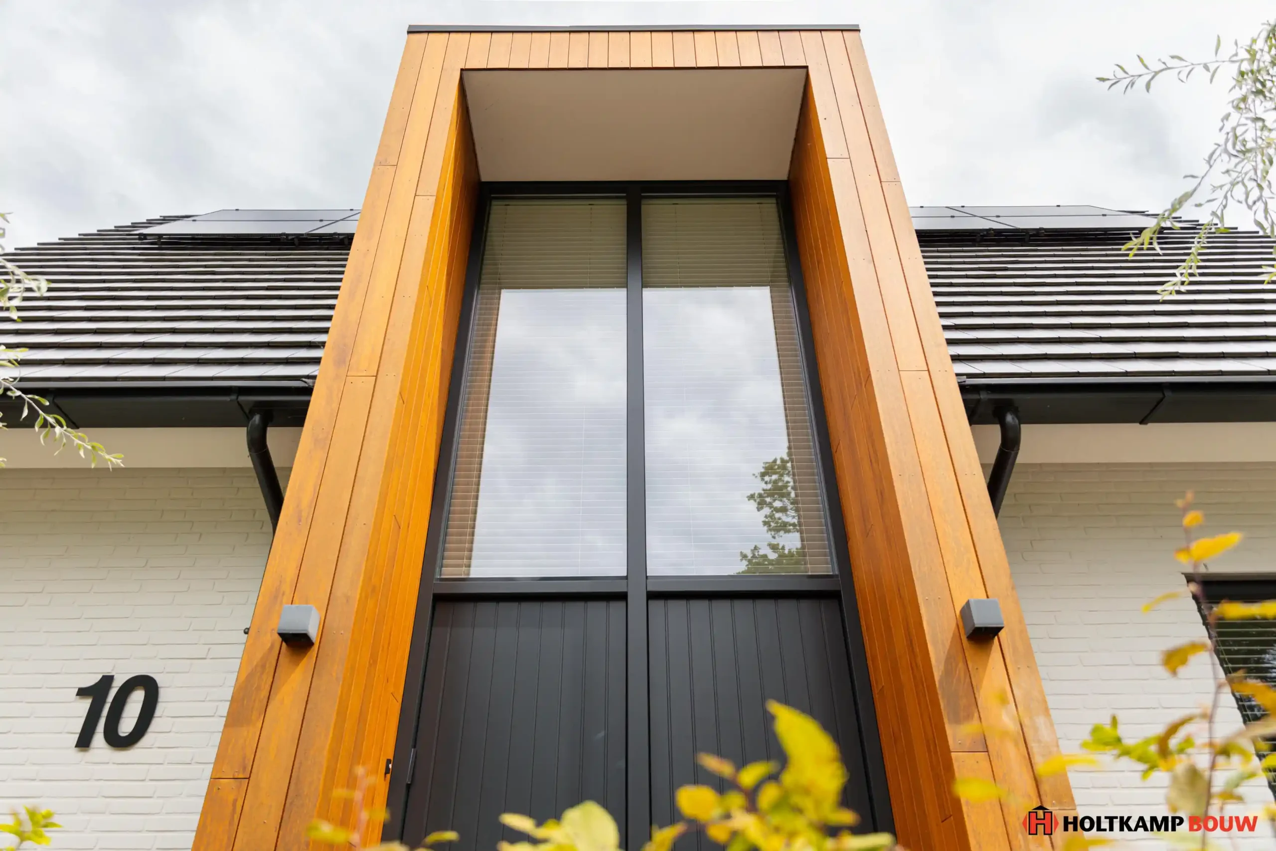 Een opvallend element van deze woning is het gebruik van Siberisch Lariks hout, dat met een natuurlijke houtkleur is behandeld met woodstain. Dit zorgt voor een warme, natuurlijke uitstraling die mooi contrasteert met de strakke witte muren. Het hout is vooral prominent aanwezig in het risaliet en het entreeportaal, waar het een uitnodigende sfeer creëert.
