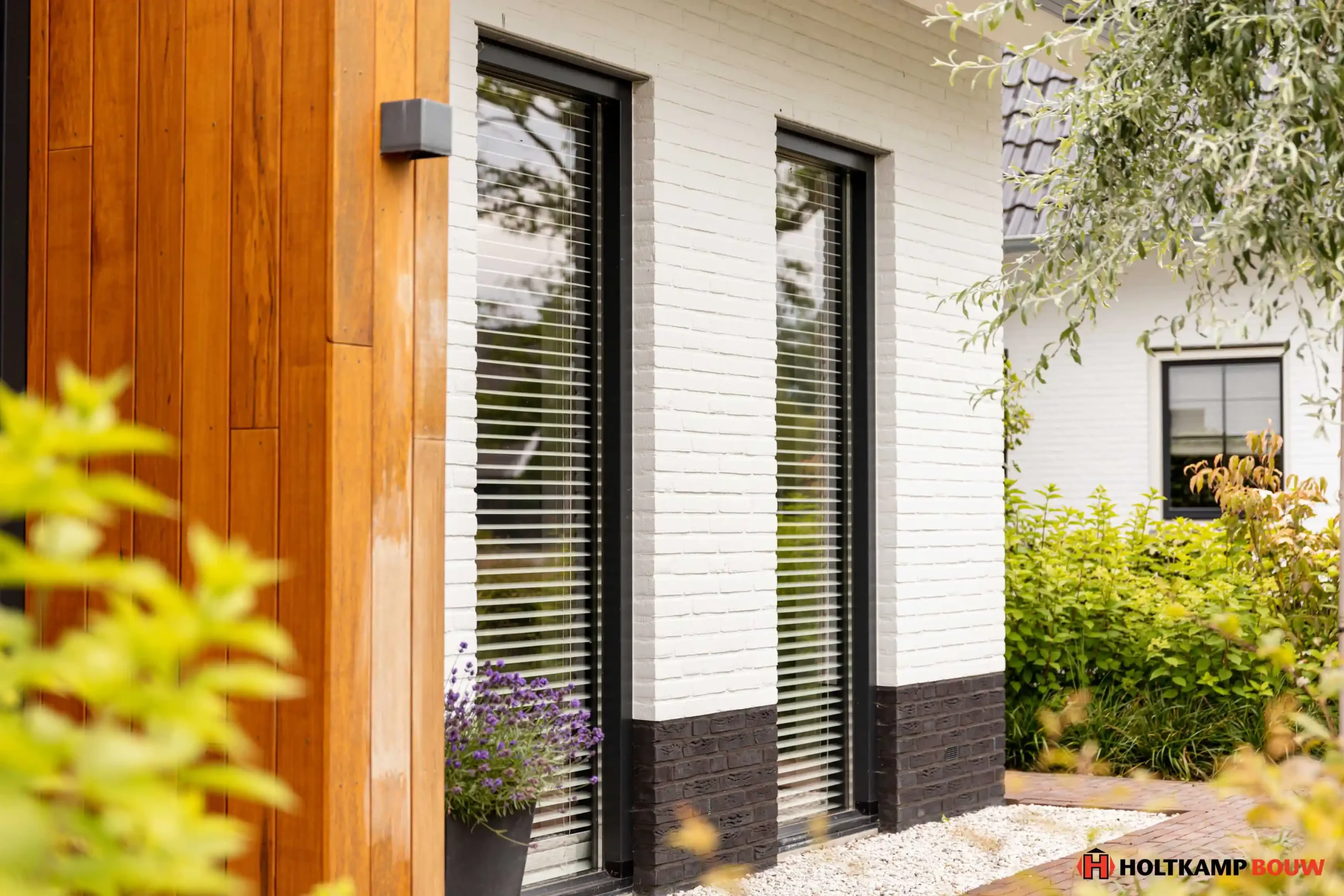 De gevel van de woning is wit gekeimd en gesausd, wat zorgt voor een schone en tijdloze uitstraling. Deze witte afwerking wordt subtiel aangevuld met een donkere plintsteen aan de basis van de gevel, wat de woning een stevige fundering geeft en een mooi contrast creëert. Het gebruik van wildverband in de gevelbekleding voegt textuur en diepte toe, waardoor het visueel interessant blijft.
